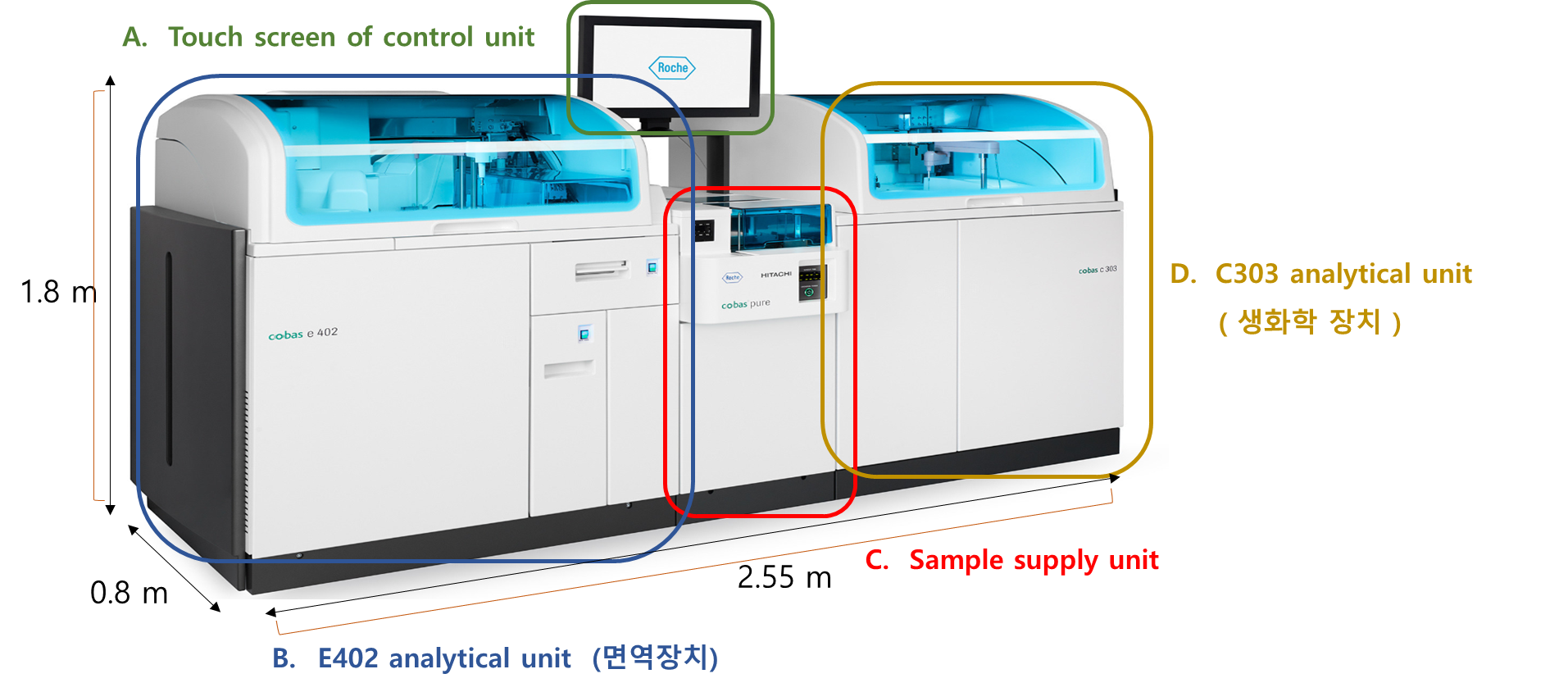 시약 | 시약 팩 종류: 코바® C 팩 그린 시약 위치: 42개 시약 팩 온보드 안정성: 최대 6개월 (분석에 따라 달라짐)2 시약 식별: RFID 시약 저장 온도: 5–15 °C 시약 적재/하역 방식: 수동 |